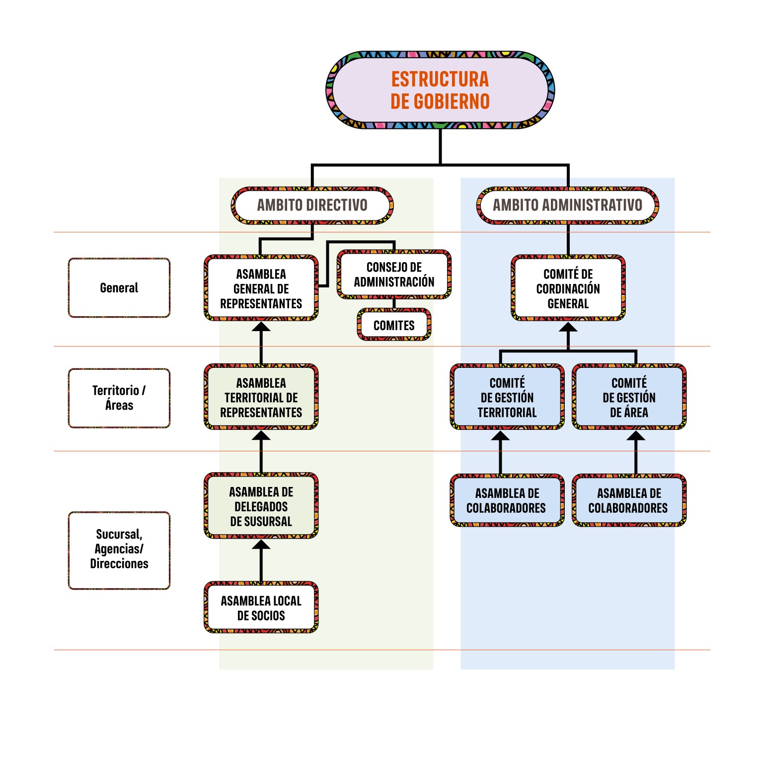 Así mismo, el Gobierno a nivel local en el ámbito directivo lo conforman la Asamblea de Delegados de Sucursal, la Comisión de Crédito de Sucursal, la comisión de Educación de Sucursal y la Asamblea Local de Socios. En el ámbito administrativo lo conforman la Asamblea de Colaboradores de Sucursal y de Dirección. Como se podrá evidenciar a continuación: