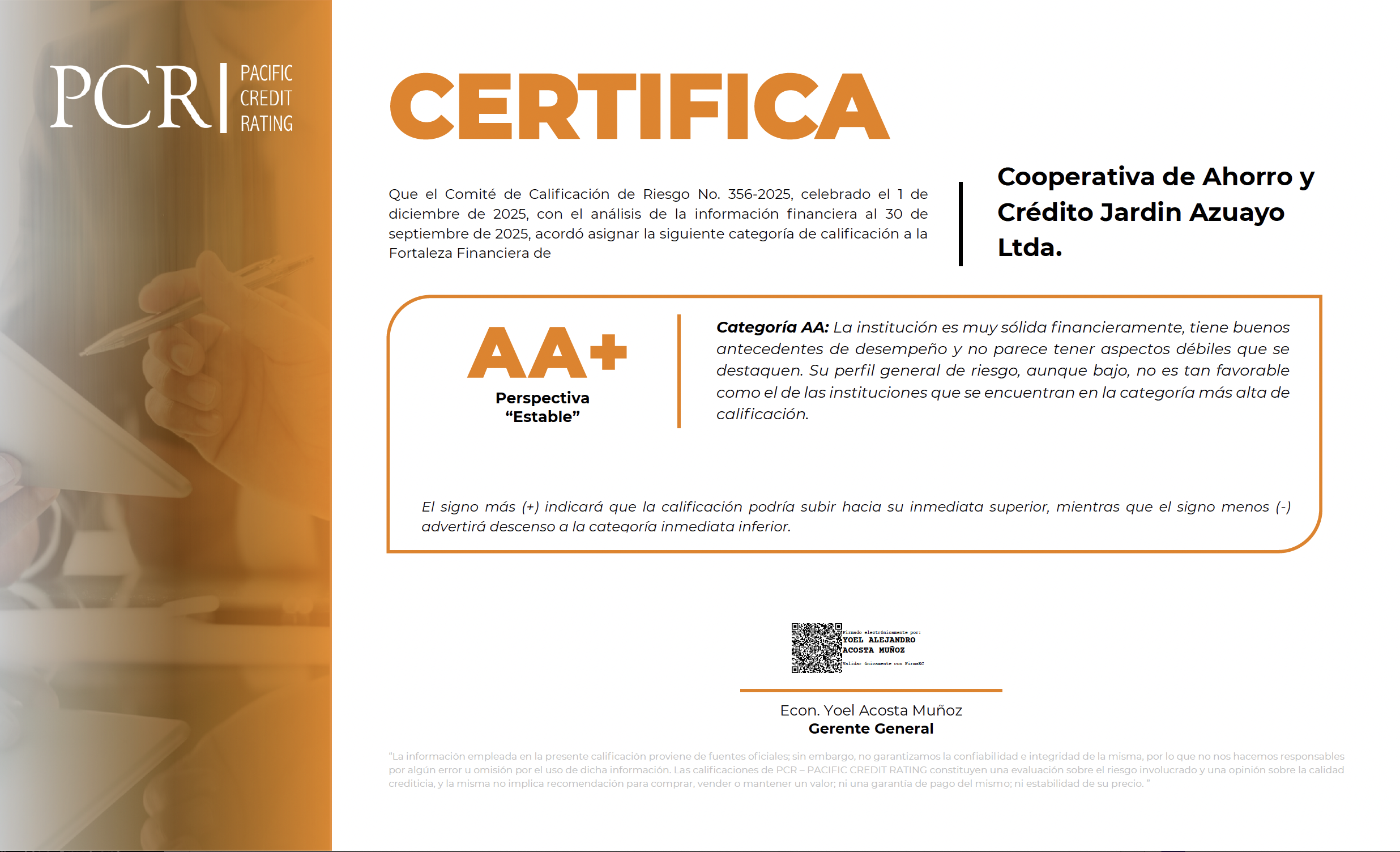 26 Dic, 2025 NOTICIAS Comentarios desactivados en Conoce nuestra calificación de riesgo / Dic. 2025 Andrea Alvarracín Principal > Noticias > Calificación de Riesgo Compartimos nuestra calificación de riesgos otorgada en diciembre 2025 por la calificadora Pacific Credit Rating la misma que refleja la solidez financiera de nuestra institución y la correcta administración de los recursos de nuestros socios. Dale un vistazo a otras noticias Únete a nuestra comunidad de Socios en el Exterior Tus ahorros están protegidos ¿Necesitas asesoría personalizada? Más noticias para ti Previous Convocatoria Asamblea General Extraordinaria de Representantes